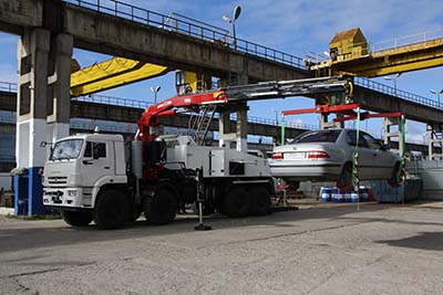 Основной элемент конструкции эвакуатора - стрела, при помощи которой осуществляется подъем оси эвакуируемого автомобиля и транспортировка методом частичной погрузки. Ходовые испытания основной стрелы эвакуатора включали в себя испытания тяжёлым грузовиком Hino-500 c КМУ и полуприцепом. Разумеется, прошли успешно.